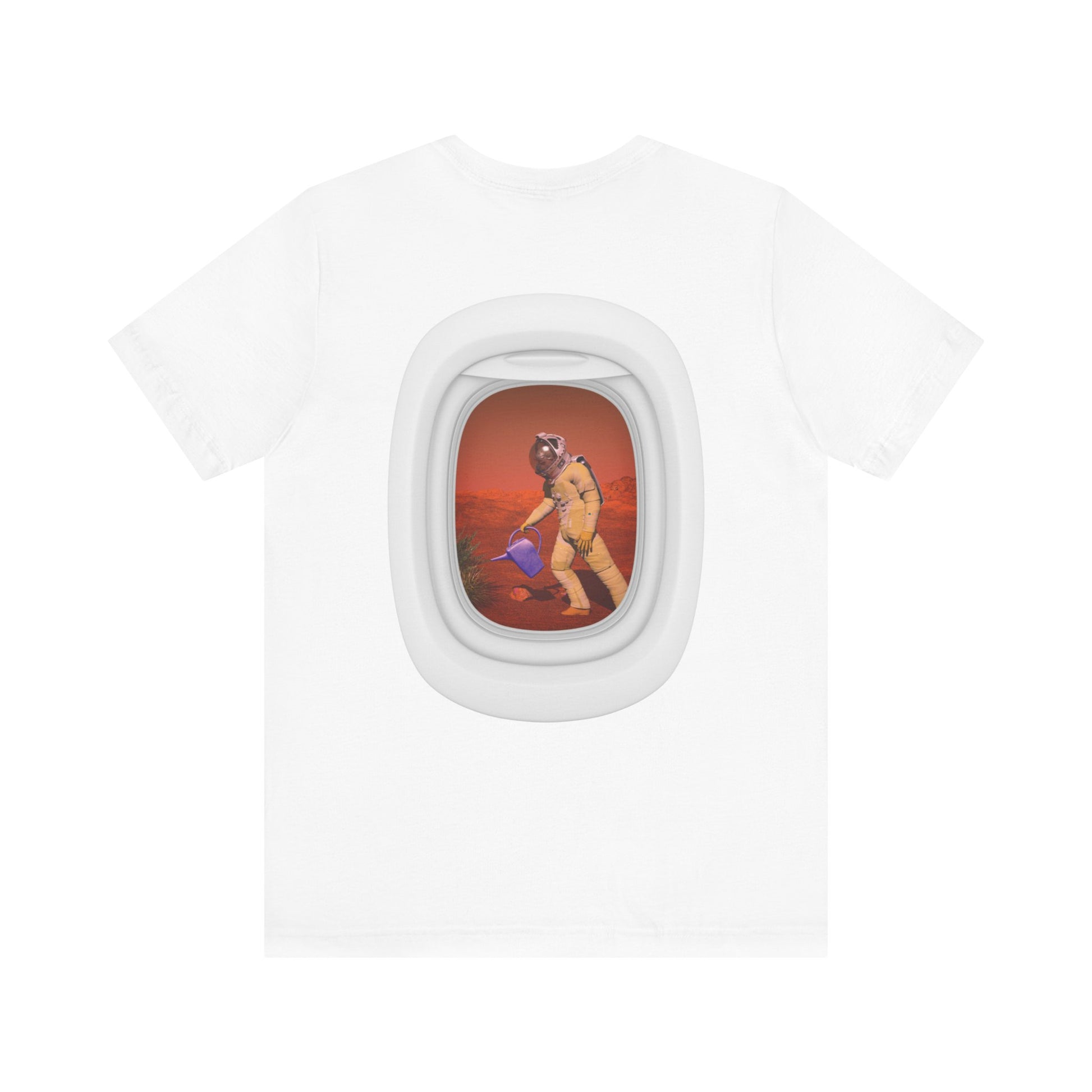 Embark on a cosmic gardening journey with our 'Space Gardener' T-shirt, featuring an astronaut nurturing life on Mars one drop at a time, a breathtaking view from a plane window.